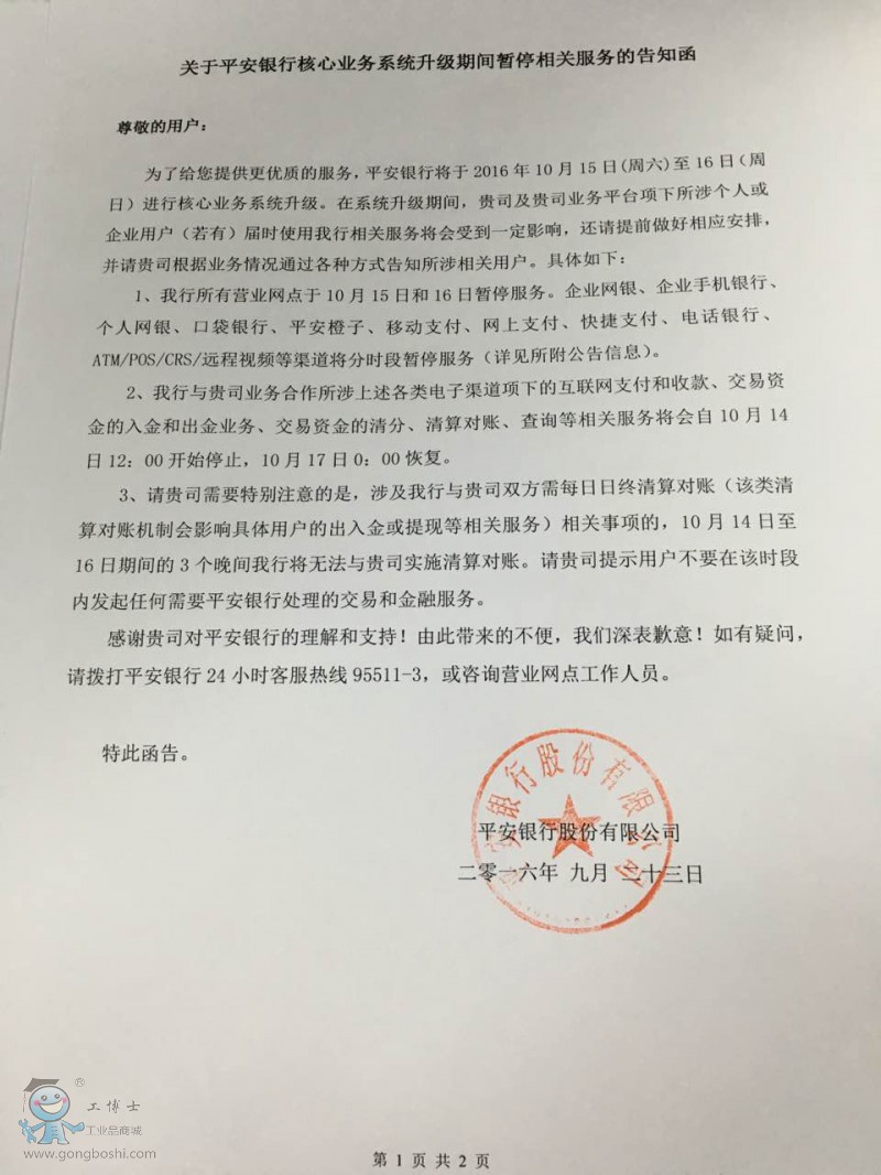 平安銀行系統升級-10月13日至17日在線支付暫停使用五天