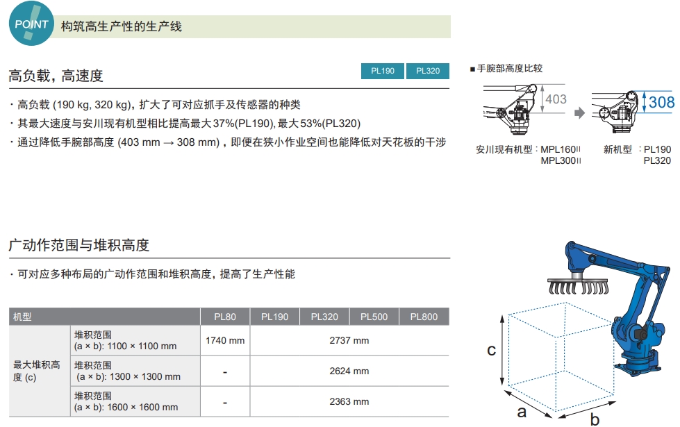MOTOMAN-PL系列可對應多種形狀、大小的工件。特別是PL190,可對應箱裝、袋裝貨物的高速碼垛。
