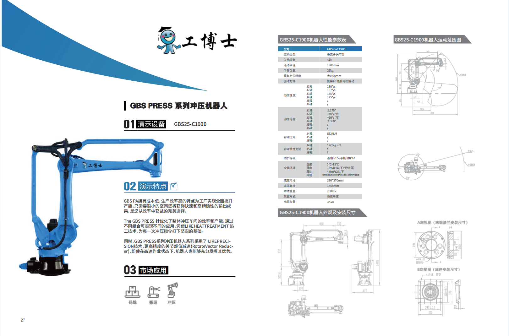 GBS PA擁有成本低,生產效率高的特點為工廠實現全面提升 產能,只需要很小的空間您將獲得快速和高***性的輸出成 果,是您從效率中獲益的***選擇。 The GBS PRESS 針優化了整體沖壓車間的效率和產能,通過 不同組合可實現不同的應用,憑借LIKEHEATTREATMENT 熱 工技術,為每一次沖壓指令打下堅實的基礎。 同時,GBS PRESS系列沖壓機器人系列采用了 LIKEPRECI